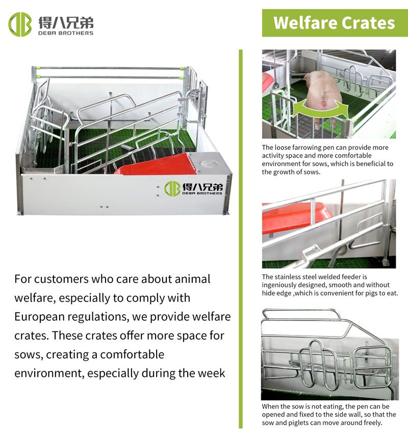 Our welfare crates are meticulously crafted to provide ample space for sows, ensuring their comfort and well-being, especially during the critical farrowing period. Unlike traditional crates, our loose farrowing pen allows for increased activity space, fostering a more natural environment for sows and contributing to their overall health and development.