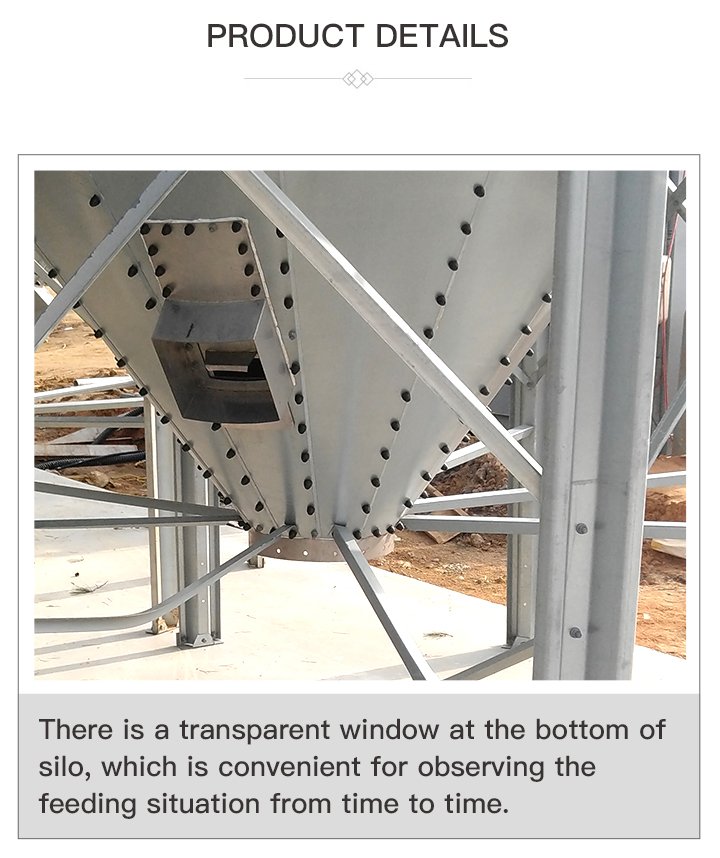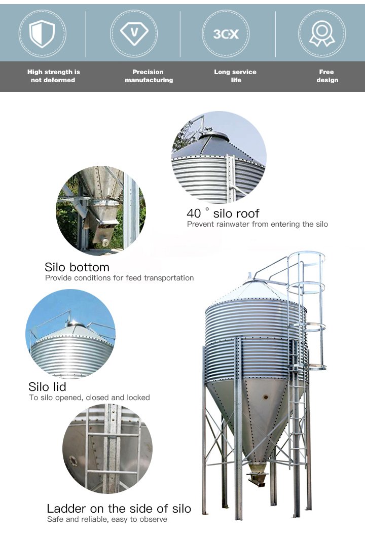 The silo is used for feed storage in large and medium-sized farms, in the outlet with the feeding equipment, can send the feed to the inside feed line.