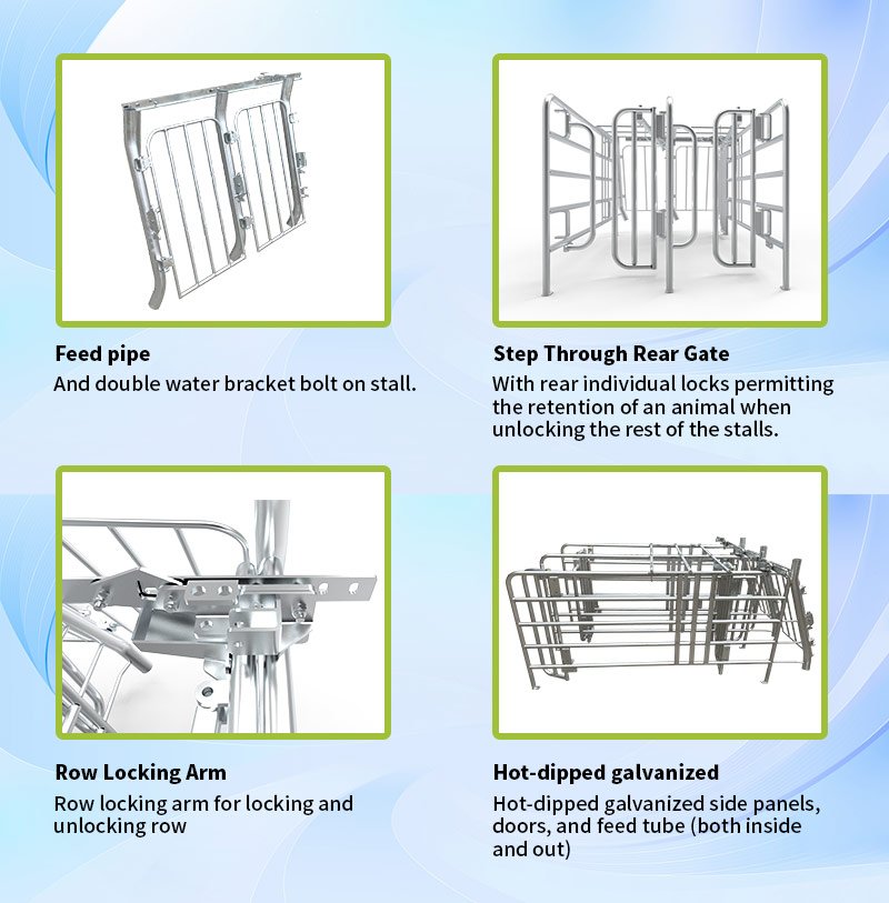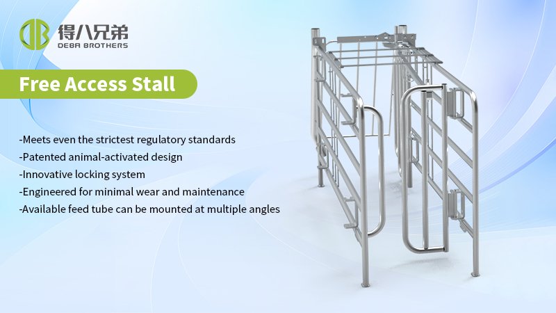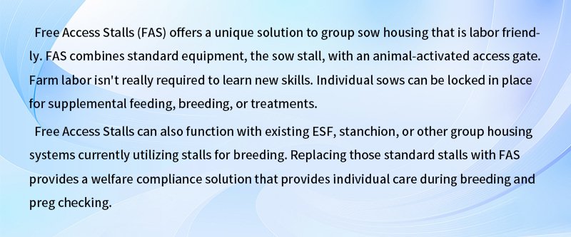 Our Freedom Stall (free access stall) offers a practical and simple solution to animal welfare and management challenges. Its simple, patented design allows sows to freely enter and exit through the animal-activated rear gate, which gives sows the choice of privacy and prevents other pigs from entering once occupied. This stall also features an innovative locking system that allows an individual stall, a group of stalls or a whole row to be temporarily locked for pregnancy checks or exams.