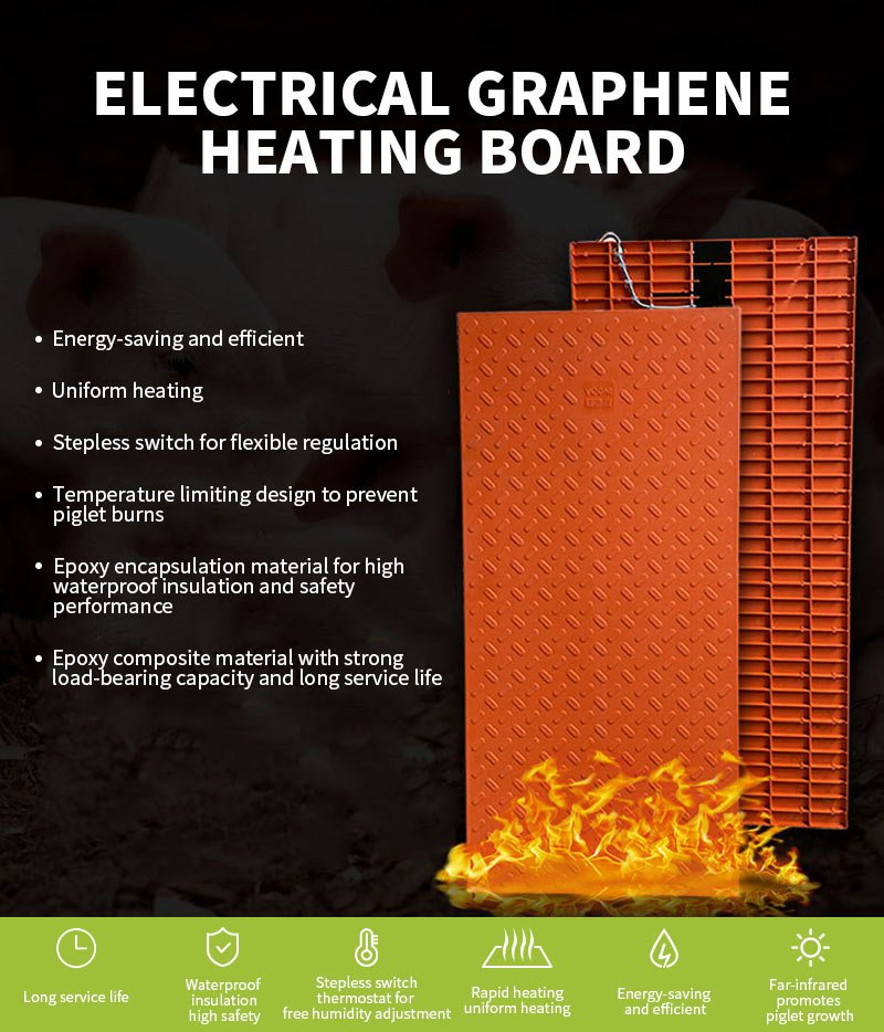使用我们的电石墨烯加热板体验无与伦比的温暖和安全,专为仔猪护理量身定制。我们的板提供节能和高效的供暖,确保您的牲畜有一个舒适的环境。独特的均匀加热系统均匀分布热量,消除冷点,促进仔猪的健康。